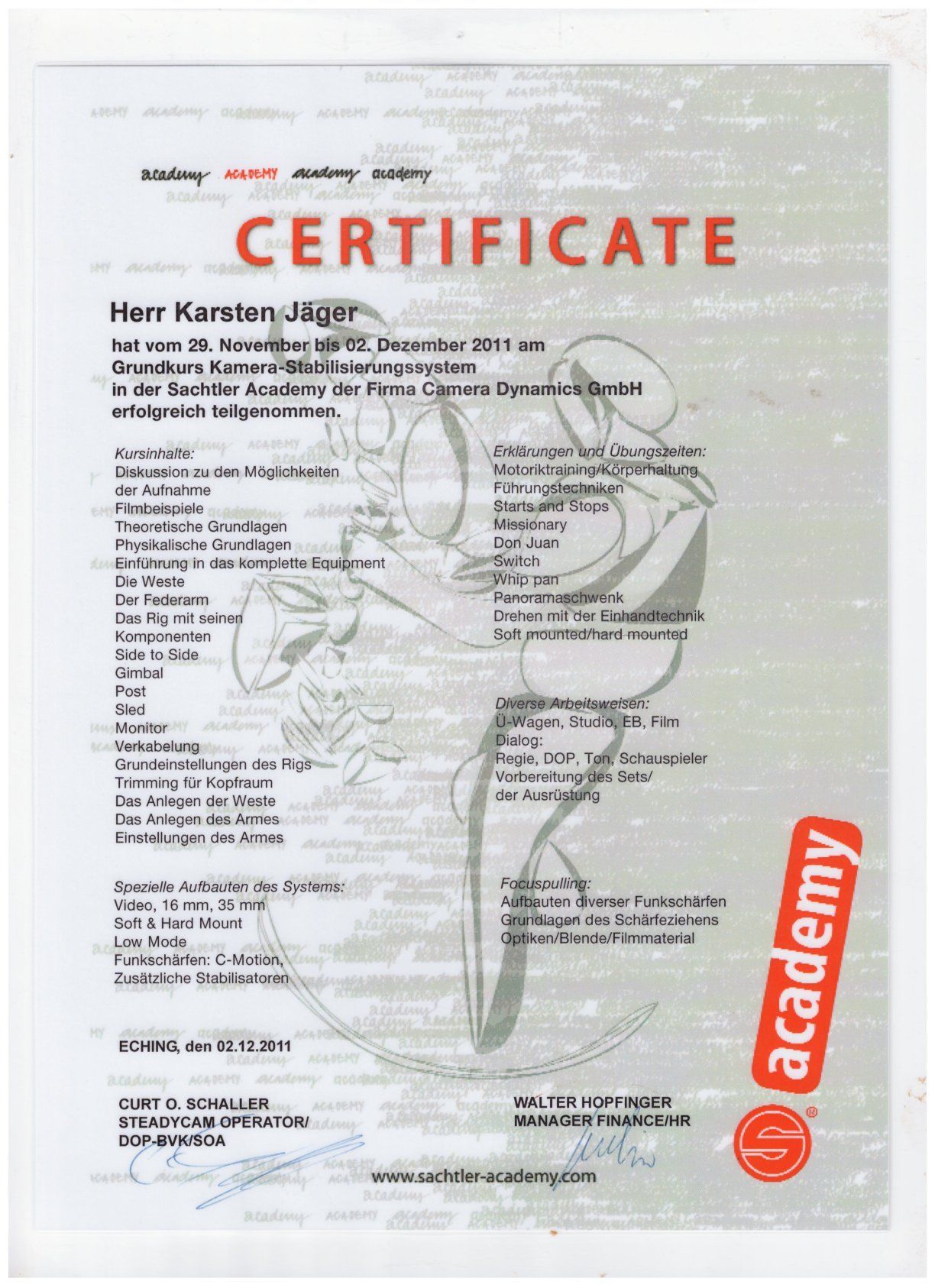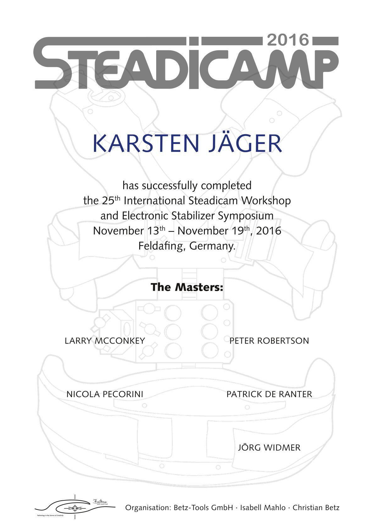 During my studies I started to work as a freelance cinematographer and early discovered my fascination for Steadicam. My first semiprofessional second hand rig I bought in 2011 for 4.000 borrowed Euro and from there went through many years of practise, workshops and upgrades leading to my todays skillset, gear and experience of over 13 years, hundreds of projects and just the finest selection of A-Brand stabilizer equipment an operator could wish for.
